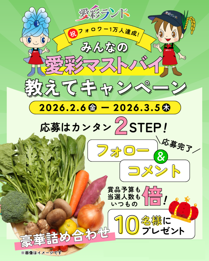 インスタグラムのキャンペーン投稿に、『愛彩ランドマストバイ商品』をコメントしてください。