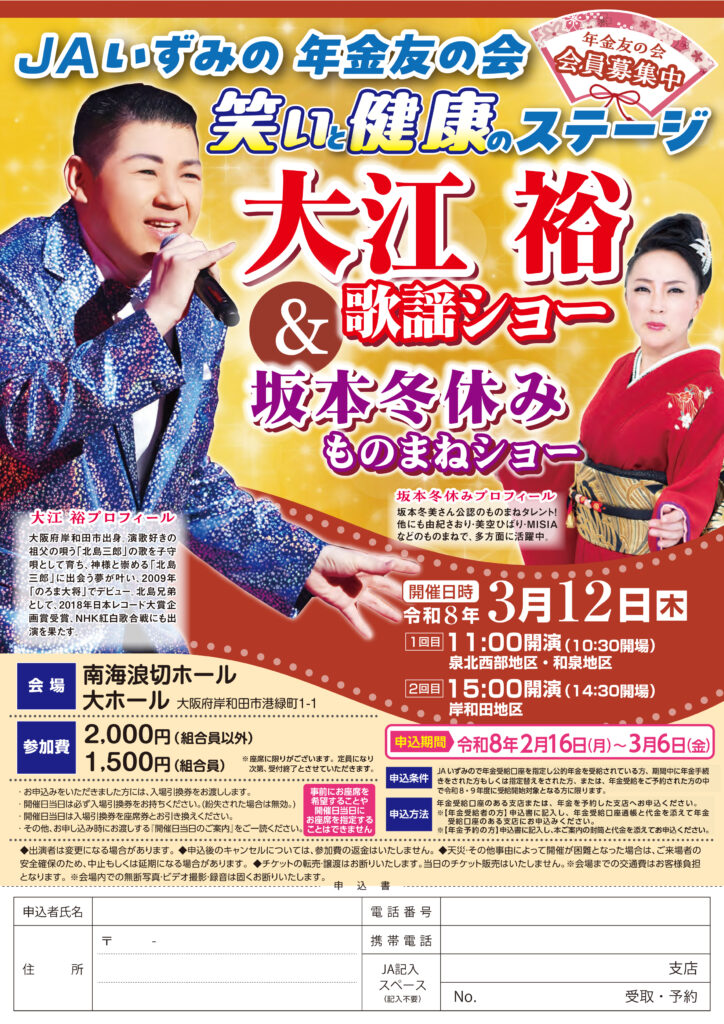 JAいずみの年金友の会は令和8年3月12日(木)、「笑いと健康のステージ」を企画しています。